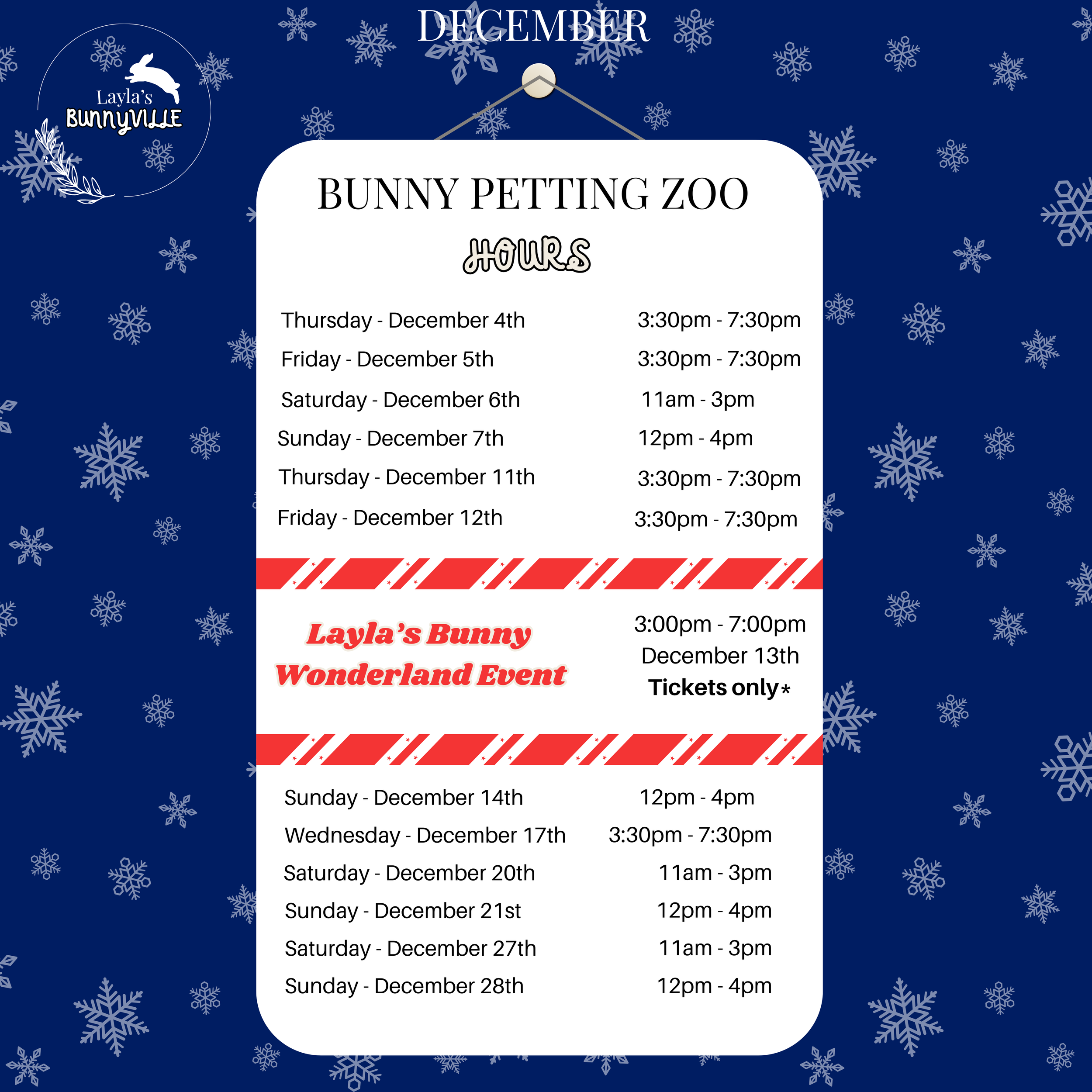 At Layla’s Bunnyville, petting our adorable bunnies is simple and fun! First, check our schedule to find out when we’ll be at La Jolla Acai Bowls—we’re only there on special bunny event days, so don’t miss us! You can book a reservation in advance to guarantee your spot, or join our on-site walk-in waitlist; please note that wait times may occur. Come ready for cuddles, smiles, and some fluffy fun! $10 for 10 minutes per person or $20 for 20 minutes per person.